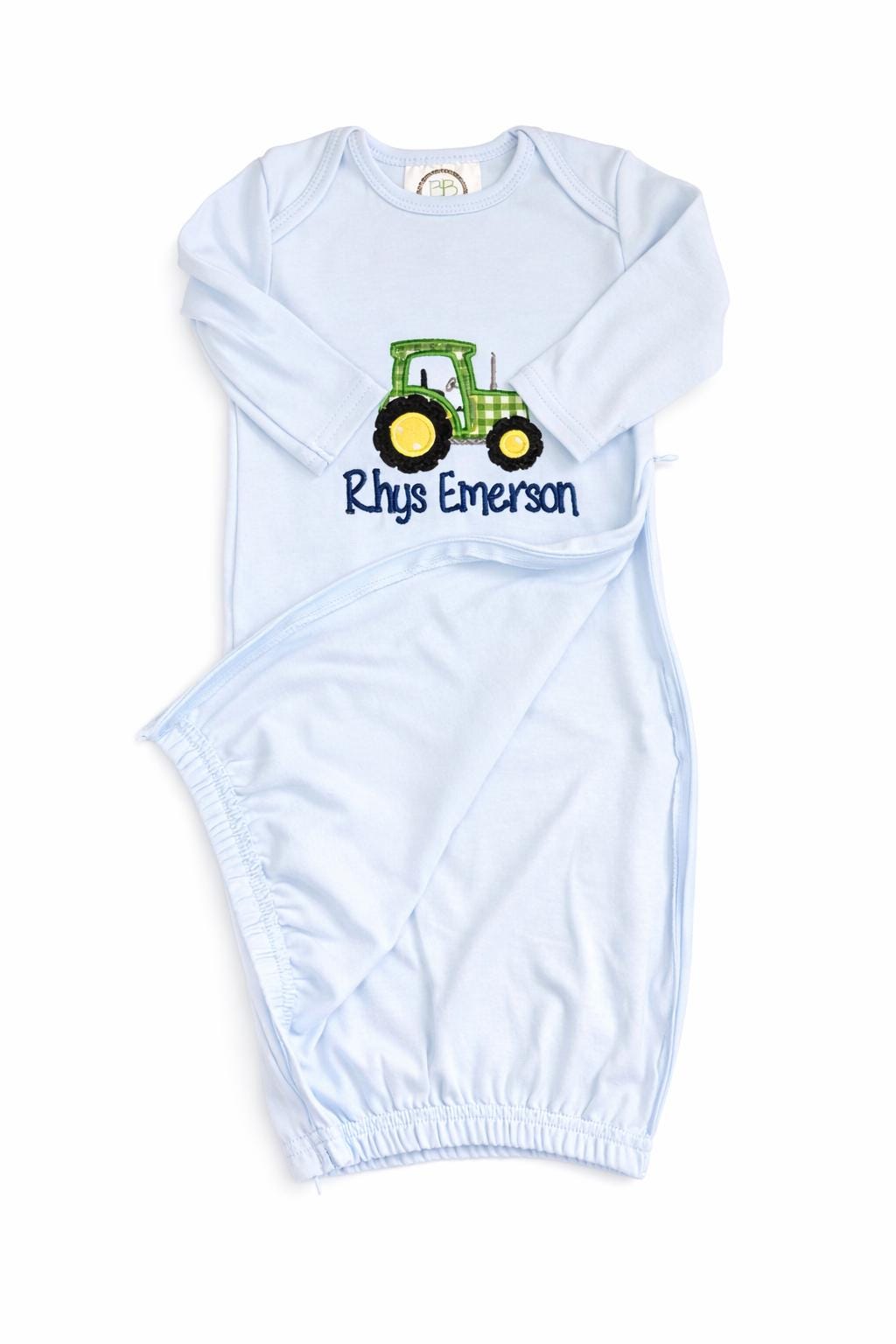 Sweet beginnings deserve timeless details. This personalized baby gown set is lovingly made with comfort and tradition in mind. Featuring a soft blue gown embroidered with a classic tractor design and your baby’s name, this piece feels both nostalgic and playful—perfect for welcoming a little one home. Finished with gentle elastic at the hem and side zipper for easy diaper changes and paired with a matching embroidered bib, this heirloom-inspired set is a thoughtful gift that will be cherished long after those newborn days have passed.